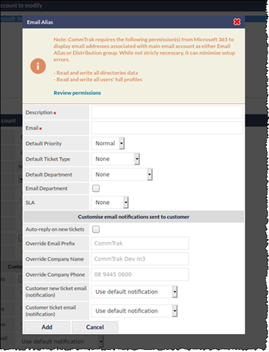 Some of these permissions are not required for normal operations, and are only required for simplifying the configuration of some features, such as the permissions for determining which aliases and distribution groups are related to the main Ticket email account; if this permission is not enabled, a notification will be displayed in the relevant area of the Tickets From Emails settings: