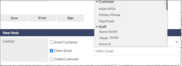 A few months ago, we added the ability to select an email address from your Customer contact list, your Staff list, or by manually typing in the address, in the Email sections throughout CommTrak.