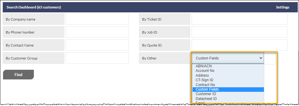 As with all items in the By Other dropdown list, the Custom Fields search box can be added to the main search fields by clicking the search Settings option (shown top-right in the above image) and customising as required. See Support Centre article Search Dashboard for more information about customising this area.