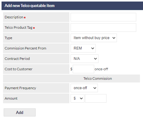 The Add new Telco quotable item section is displayed as shown: