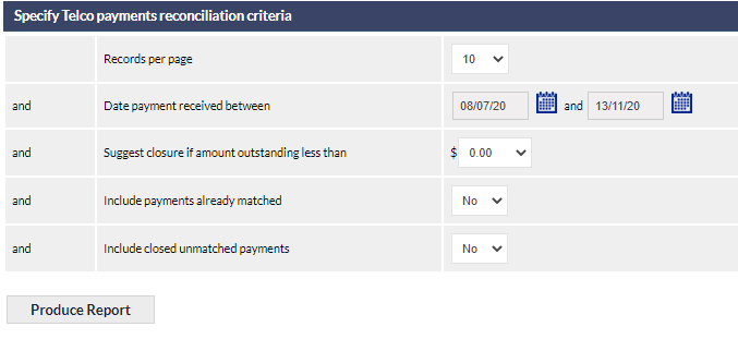The following fields are available in the Specify Telco payments reconciliation criteria section: