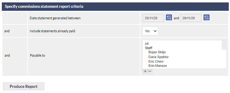 This field determines which staff will be included in the report; by default the commissions report will include all staff.