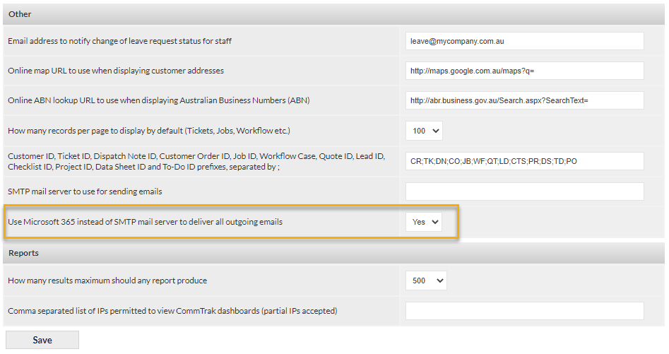 - Set Use Microsoft 365 instead of SMTP mail server to deliver all outgoing emails to Yes and click Save.