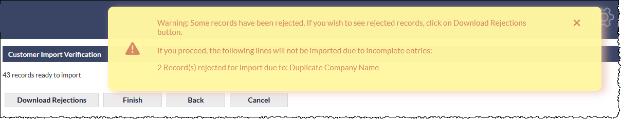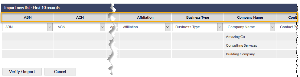 Imported records are considered to be duplicates if the Company Name and Suburb fields are identical to existing records, and will be rejected at the verification stage: