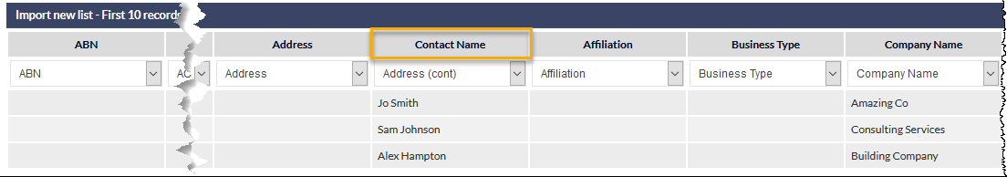 In the following example, the first row of the CSV file contains a column labelled Contact Name, which is not a valid CommTrak field. The column has been matched Address (cont), which is the first available unused field in the list of CommTrak fields: