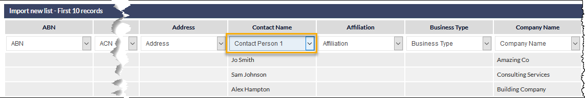 Return to the previous screen ( Import new list); this will enable you to review the first 10 rows of data, and select alternative CommTrak field label headings if needed.