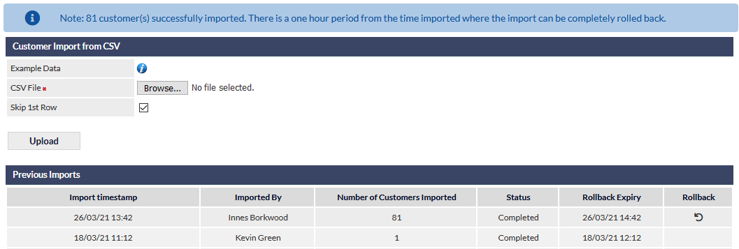 Upon completion of the import, the main Customer Import from CSV screen is displayed, with a notification banner advising of the rollback period: