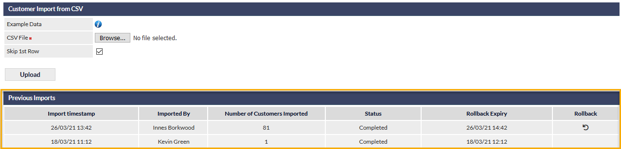 Previous Customer imports, if any, are listed in a table below the import options on the Customer Import screen: