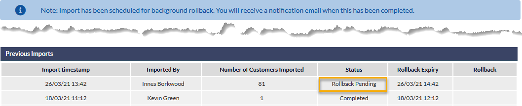 The Rollback feature is available for one hour after an import has occurred, after which it is disabled, and the rollback can no-longer be executed.