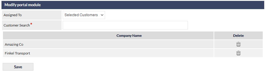 All customers under the Company Name heading (for example, Amazing Co and Finkel Transport, in the previous image), will be able to view the module.