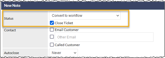 Tickets can now be converted to Workflows by changing the Status to Convert to workflow prior to adding a Ticket note.