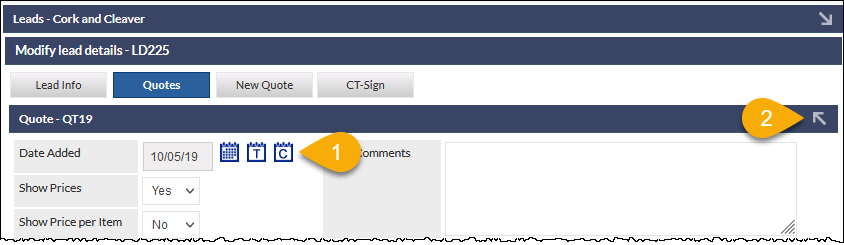 It is now possible to retrospectively change the Date Added field in a Quote (highlighted 1 in the following image):