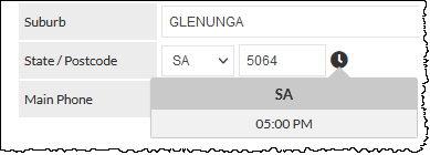 A Time Zone (clock) icon has been added to various screens. Hovering the mouse cursor over the icon presents a pop-up displaying the current time, based on the State field for the current record.
