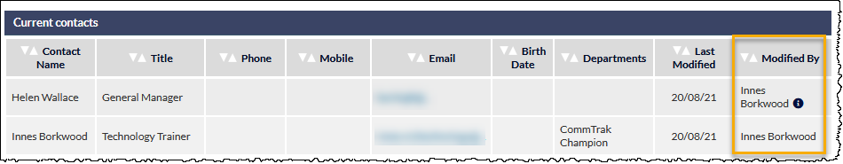 A Modified By column has been added to the Current contacts list (available in both the Customer and Lead Contacts screens):