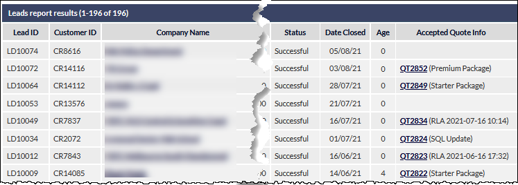The following image shows an extract from a Leads Report that was generated with the Accepted Quote Info criterion selected: