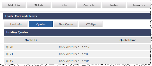 Existing Quotes can be viewed by clicking the Quotes tab in a selected Lead (highlighted blue in the following image, as it is currently selected):