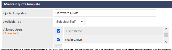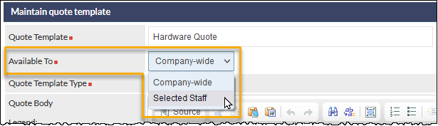 When editing a Quote Template, the Available To field is now displayed (with a default of Company-wide). To assign a template to staff members, choose the Selected Staff option from the dropdown list: