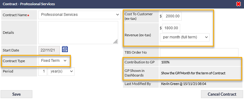 The GP Shown in Dashboards and Contribution to GP fields (visible in the previous image) are configured in the Services & Software (SaS) settings for the selected Contract Type.