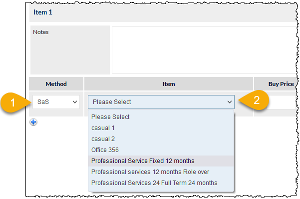 Services & Software items can be added to a Quote by selecting the SaS method, then choosing the required contract item: