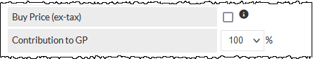 If Buy Price is unticked (default), the Contribution to GP (visible in previous image) must be specified by selecting a percentage from the dropdown list (default 100%).
