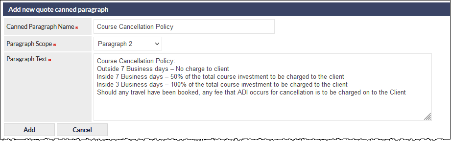 The following image shows a canned paragraph being created, prior to the Add button being pressed.