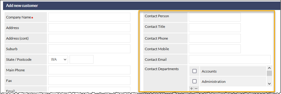 When adding a new Customer, the Contact fields are presented as shown in the following image: