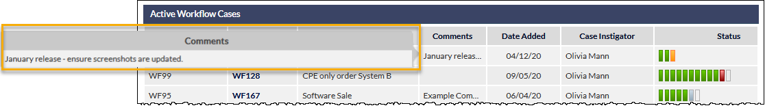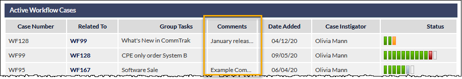 A column for the Workflow Comments field has been added to the Workflow Case lists in the Customer's Workflow tab: