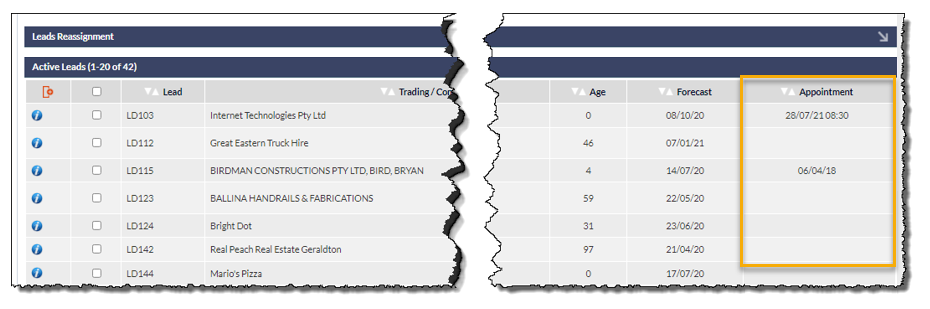 Reminder: Current appointments are listed on the Active Leads screen, as highlighted in the previous image.