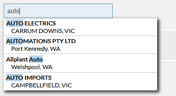 This is a standard CommTrak company name search field. A minimum of three consecutive characters is required to display a list of matching CommTrak companies: