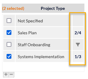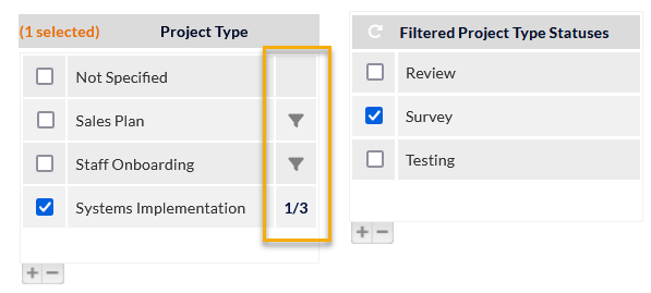 It is important to be aware that, even when the Filtered Project Type Statuses section is hidden, selected Status filters still apply. Note the numeric indicators in the following image, showing how many Status filters are active for each Project Type: