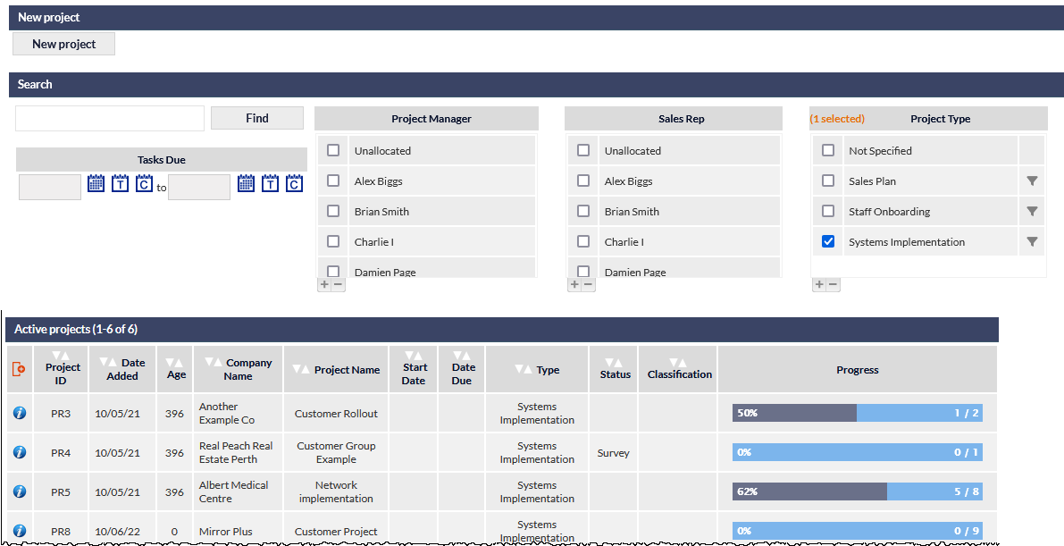 Tick the Sales Rep names to filter the list of Projects according to staff member assigned as the Sales Rep.