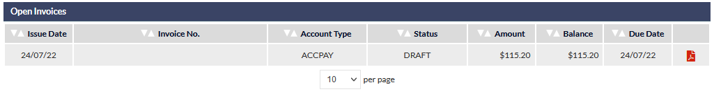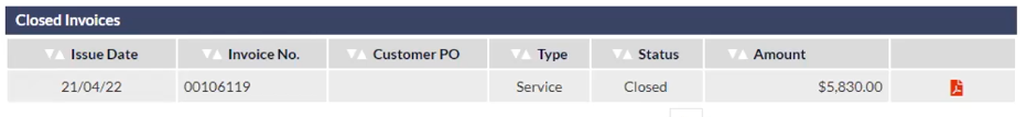 If a PDF of the invoice is available, an icon will be displayed in the final column (visible in the previous image). Clicking the icon will either open the invoice in a new browser tab, or download the invoice, depending on the configuration of your browser.