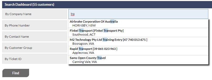 Typing three or more consecutive characters from a Customer or Contact telephone number into the By Phone Number search field will display a list of all matching phone numbers (if any), along with the company name, in a drop-down list below the search field.