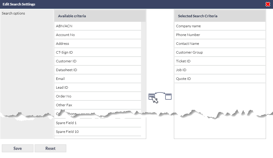 Click the Settings link to display the Edit Search Settings pop-up window, which enables you to drag-and-drop from the available search criteria fields (on the left, in the image below), into the Selected Search Criteria section (on the right, in the image below). In addition to being able to select which search criteria are displayed on the Search Dashboard, you can also specify the order in which the search fields are displayed, by dragging and dropping the search item names as required:
