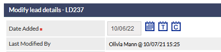 Mandatory fields are designated with a red asterisk adjacent to the field label. In the following image, a red asterisk is shown adjacent to the Date Added field label in a Lead, indicating that it is a mandatory field: