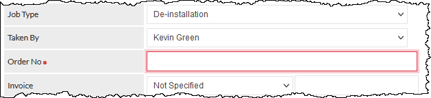 If adding / saving a record is attempted when mandatory fields are incomplete or invalid, the relevant field(s) will be highlighted with a red border. In the following example, an attempt has been made to add / save a Job without completing the Order No field: