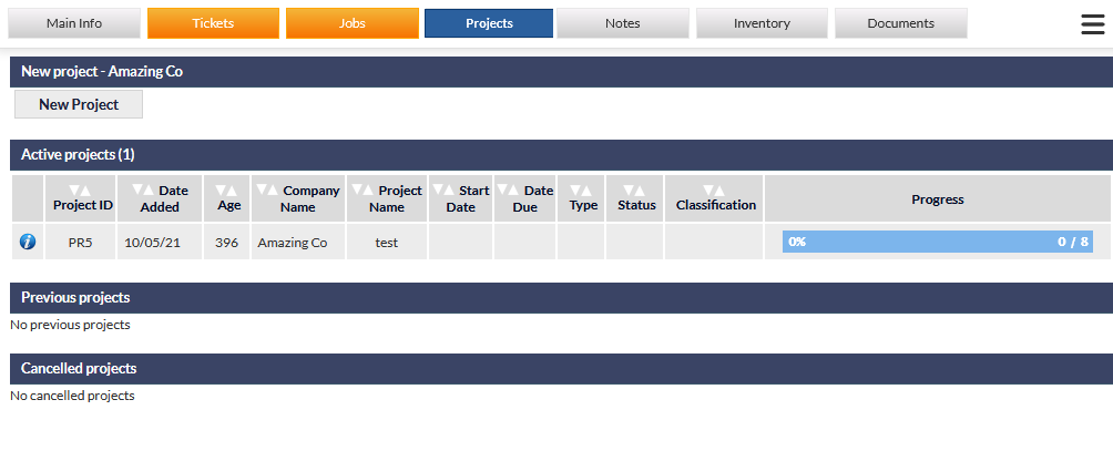 This article pertains to the Customer Projects screen, accessed by clicking the Projects tab at the top of a Customer's screen. For information pertaining to the Active Projects screen; a list of all active Projects for all customers (which can be filtered according to various criteria), see Support Centre article, Active Projects Screen.