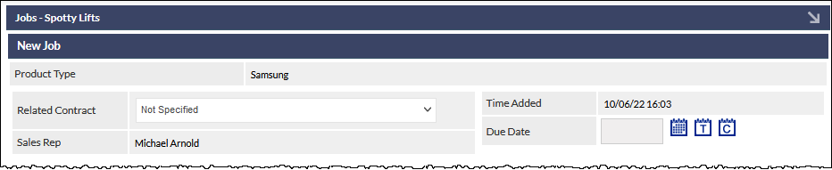 When viewed via a Job link (e.g. by clicking a Job on the Active Jobs List, or in the Jobs Summary Panel), the selected Job is the main focus of this screen, so the top-most section is displayed in its collapsed form. The direction of the arrow icon (top-rightmost) in the following image indicates that the top section is currently collapsed, therefore the New Job and Jobs list sections are hidden. This enables the details of the selected Job to be viewed and modified: