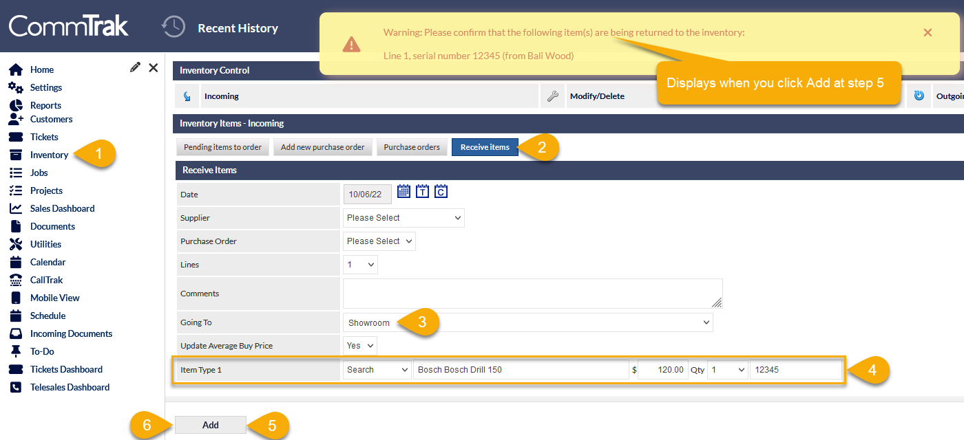 - Press Add - A yellow warning banner is displayed, advising that this in an item being returned to inventory