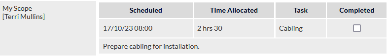 This box should be ticked when the task has been completed. Note that this tickbox is linked to the Completed tickbox in the My Scope field (visible only to the assigned technician) in the Job Details screen, as shown in the following image: