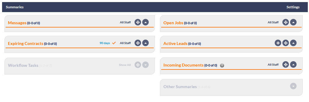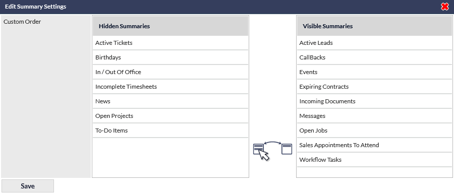 The position of panels in the Summaries area cannot be modified in the Edit Summary Settings window; to change the position of panels, reposition them by dragging-and-dropping using the Move (compass points) icon when viewing the panels on the home screen.