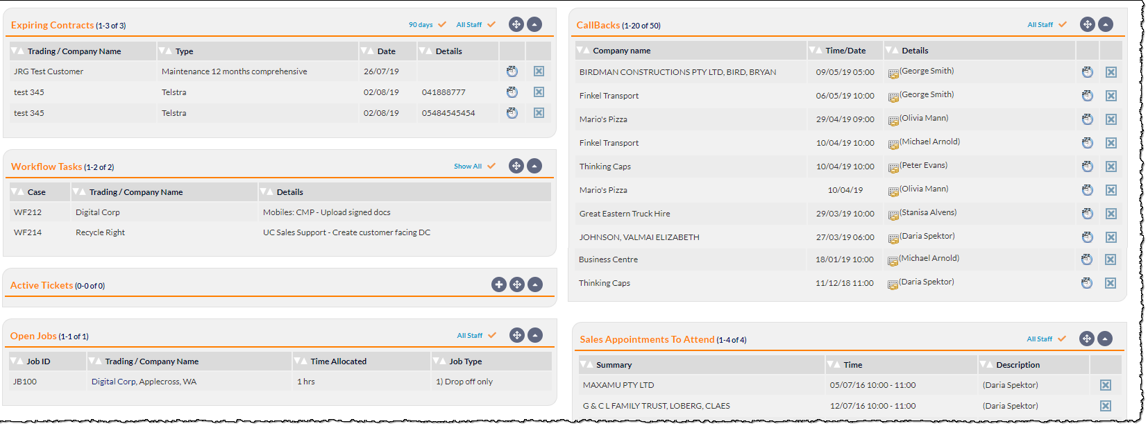 The display, positioning and, in some cases, content of Summary Panels can be customised by each CommTrak user, to better suit the needs of their role. For example, non-sales staff may wish to hide the Expiring Contracts panel. See the section, Summary Panel Features in this article, for further details.