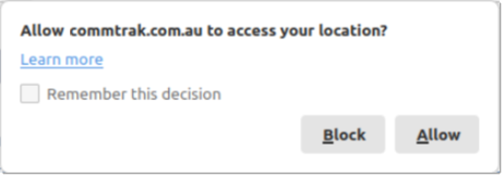 When CommTrak attempts to determine the user's location, the user is presented with a browser alert, requesting them to either block or allow geographical information to be accessed by the data sheet: