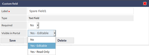Custom fields that are assigned as being visible in the Customer Portal can now be designated as either editable or read-only. When creating or editing a custom field, select the required option in the Visible in Portal field: