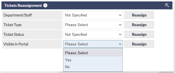 In addition to the existing Ticket bulk-reassignment features, it is now possible to bulk-reassign Tickets as being visible / invisible to contacts who are viewing the Customer Portal:
