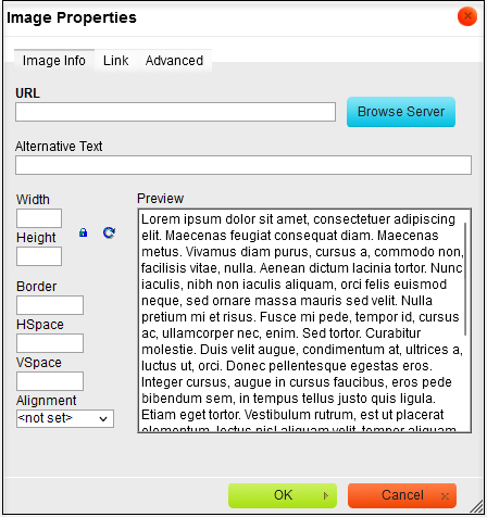 To insert an image, position the editing cursor at the location where you wish to insert the image, and press the Image icon in the toolbar. The Image Properties pop-up window will be displayed: