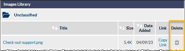 Deleting an image will 'break' links in any HTML templates in which the image is currently being used. We recommend updating HTML templates prior to deletion of images from the library.