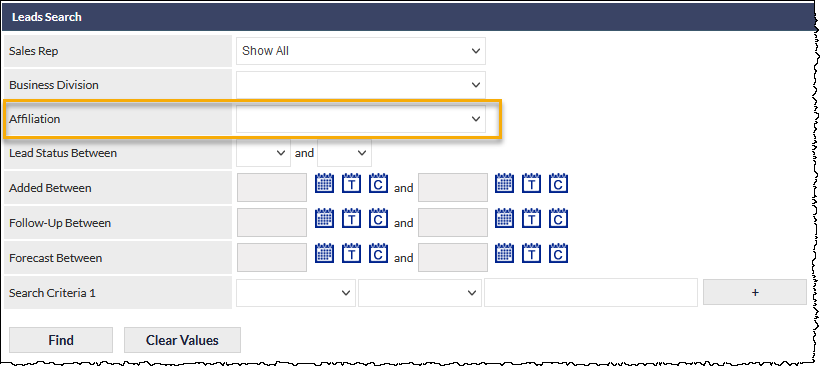 The Active Leads screen now includes an Affiliation dropdown list in the Leads Search section: