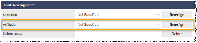 The Leads Reassignment section (only visible to users with appropriate permissions), now includes an Affiliation dropdown list: