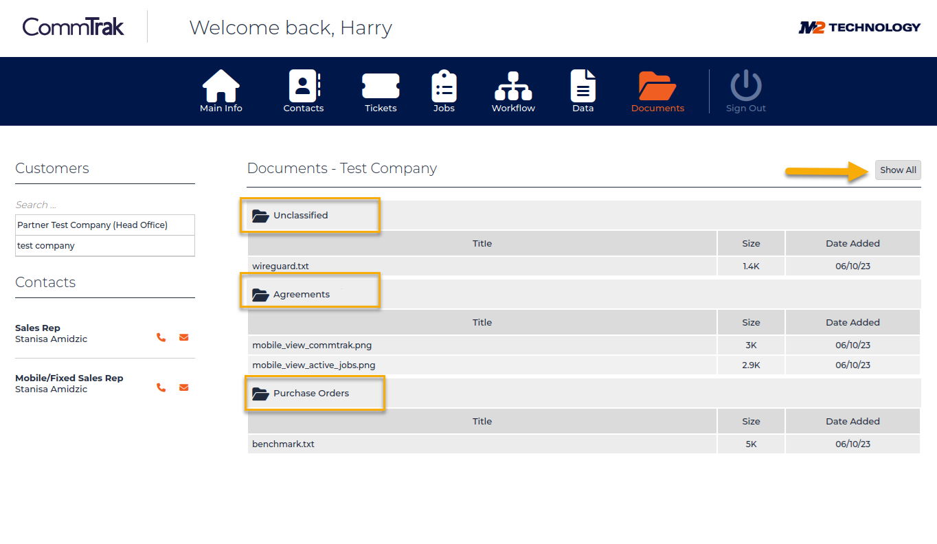 To aid in the organisation of documents in the Customer Portal, documents (which are only visible when the Documents tab is enabled in the portal settings) are now displayed in folders: